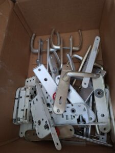 Dizaine de poignées de porte, déposées soigneusement sur chantier.