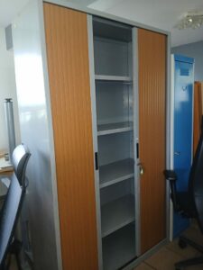 - 4 armoires en très bon état, avec ou sans clés - 1 armoire métallique sans étagères. Etat moyen. 200x100x43cm. - 1 armoire grise métallique. 200x120x45cm. Bon état. Portes coulissantes. Sans clé.