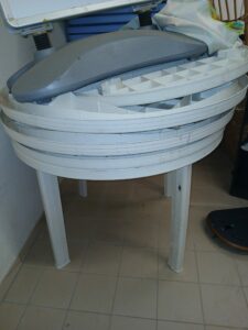 différents modèles : - tables rondes blanches (une seule avec des pieds) - tables ovales bleues ou blanches (2 avec des pieds)