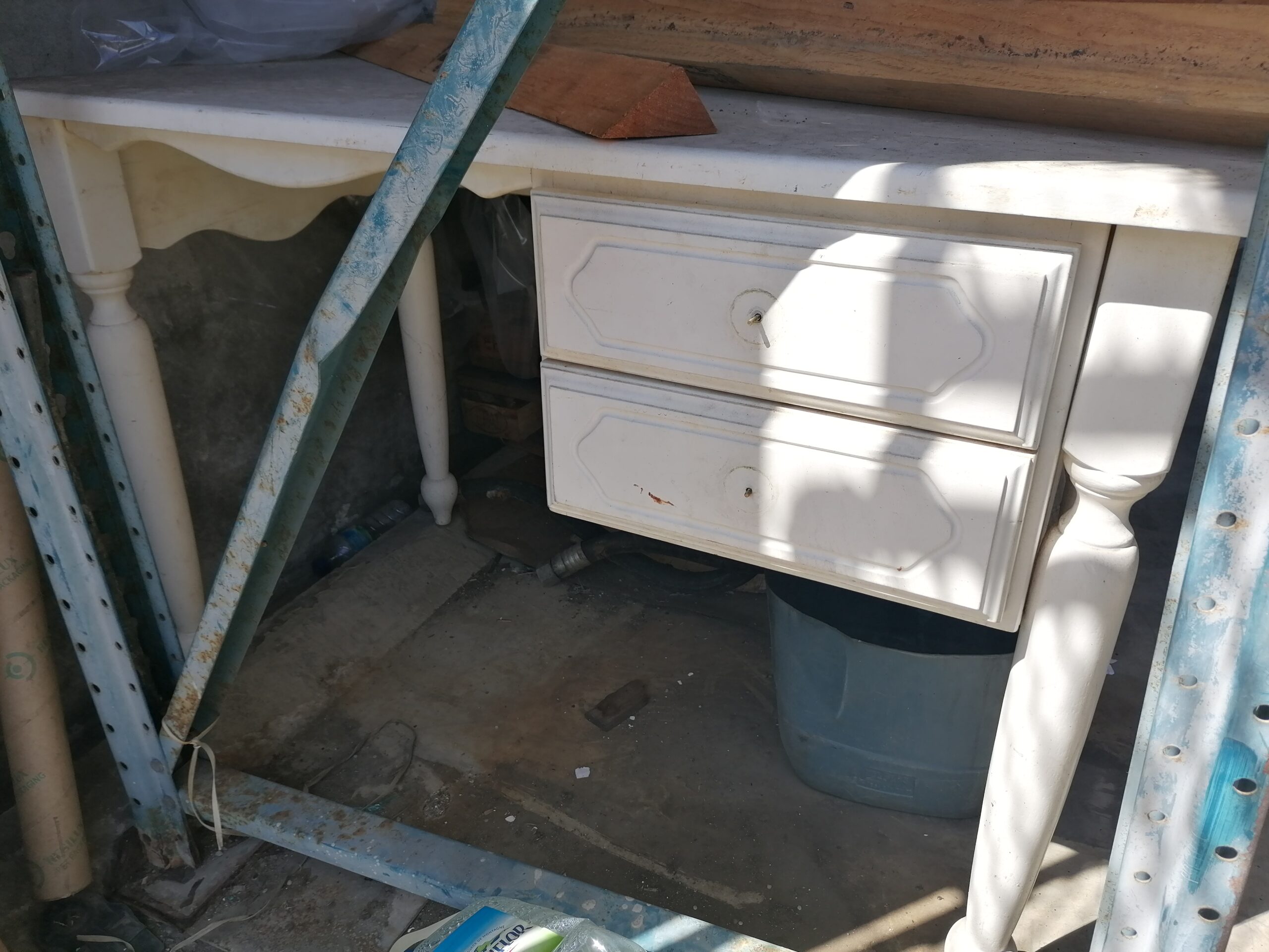 Bureau en bois, blanc, à tiroir. Stocké à l'intérieur