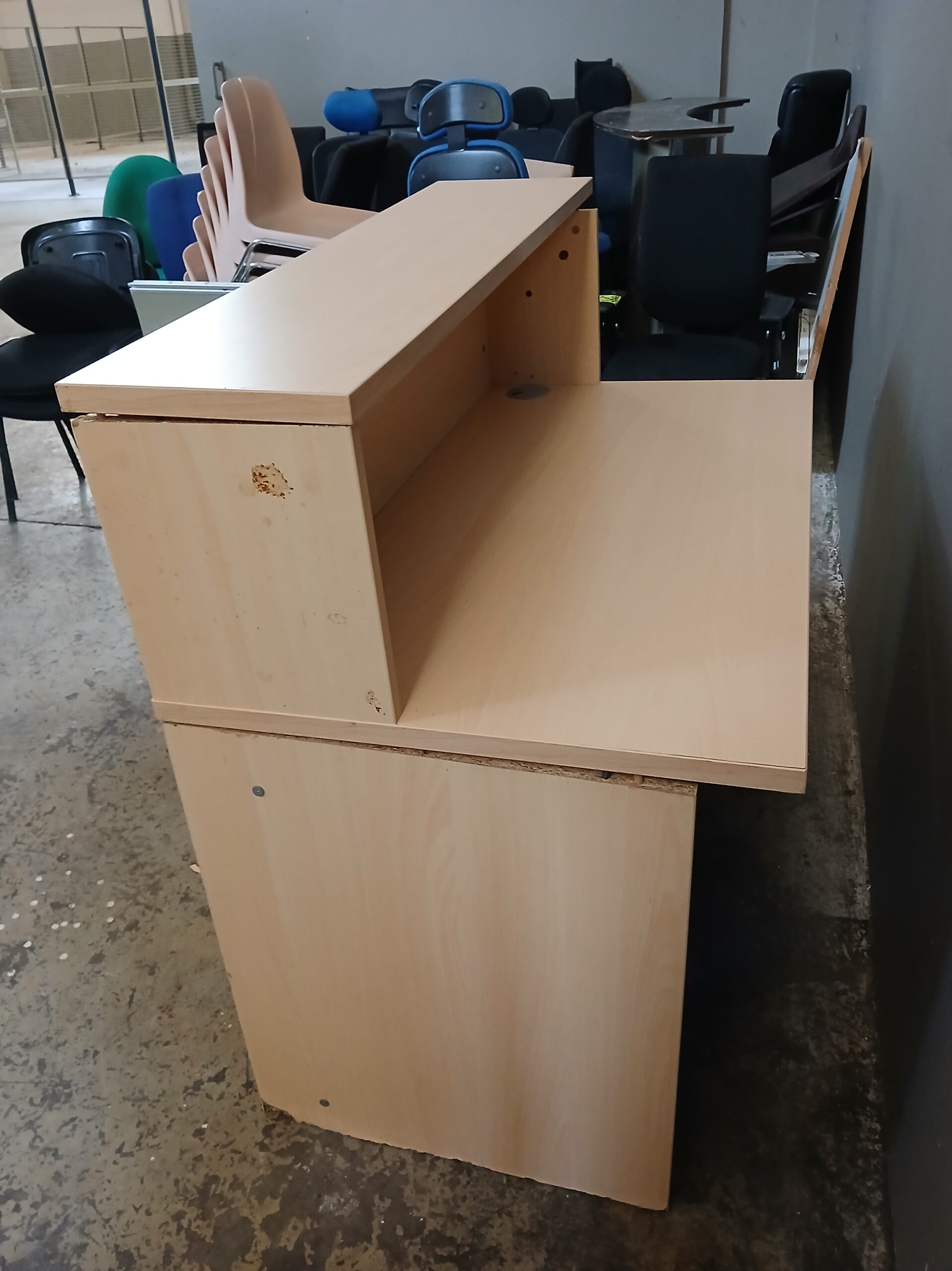 banque d'accueil en bois aggloméré, abimée, difficle à fixer. Possible récupération des planches en bois…